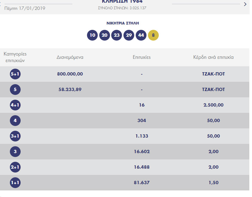 Πραγματοποιήθηκε η κλήρωση του Τζόκερ [αριθμός κλήρωσης 1984] Πέμπτη 17 Ιανουαρίου 2019.